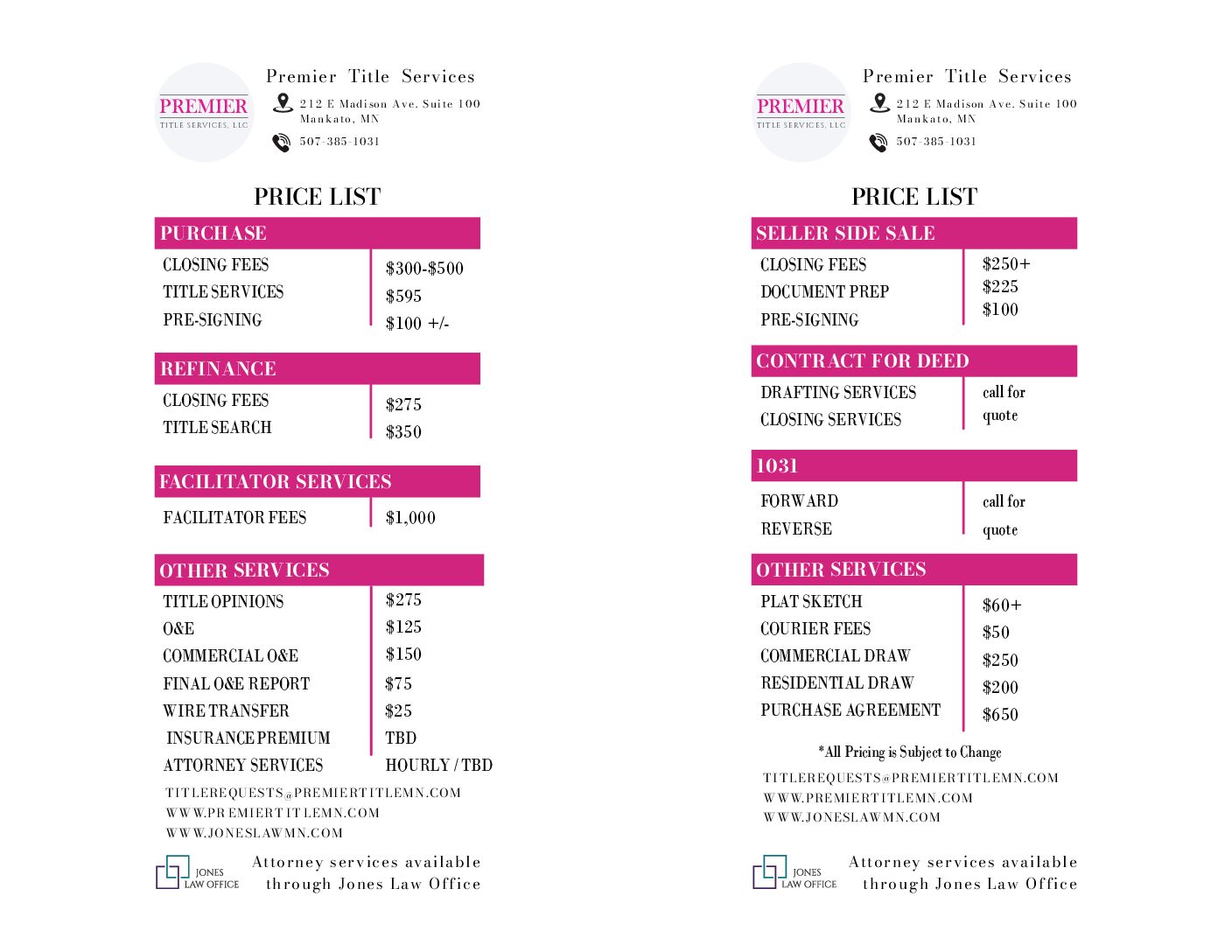 Printable: https://www.premiertitlemn.com/wp-content/uploads/2025/04/Premier-Price-List-Printable-Version-1.pdf
